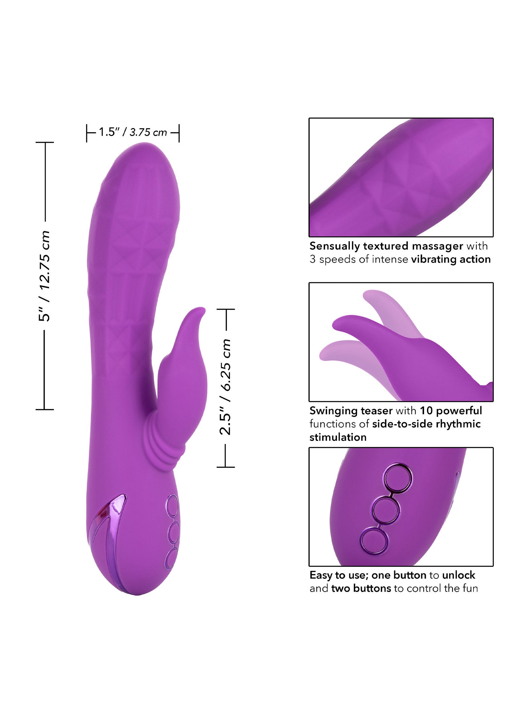 De California Dreaming Valley Vamp is een luxe rabbit vibe met een unieke swingende teaser voor clitorisstimulatie en 3 vibratiesnelheden. Daarnaast is de vibe volledig waterdicht, waardoor hij uiterst geschikt is voor gebruik in bad of douche. Laad de vibrator in 2.5 uur op met de meegeleverde USB-oplaadkabel om te genieten van 45 minuten snelle stimulatie of 2.5 uur lage snelheidstrillingen. De vibe is gemaakt uit hypoallergene, ongeparfurmeerd siliconen en is lichaamsveilig. Wij adviseren dit product te gebruiken met een glijmiddel.